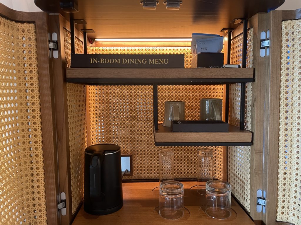 ベッド前の棚にはドリップコーヒーや紅茶のティーバッグがセットされています。