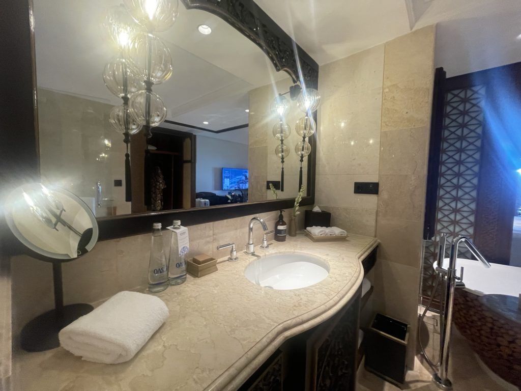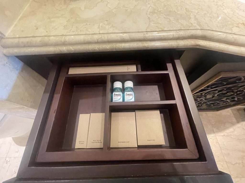洗面台は広々としていて使いやすい造りでした。歯ブラシやシャンプー類など、基本的なアメニティは一通り揃っています。化粧水などは持参必須です。