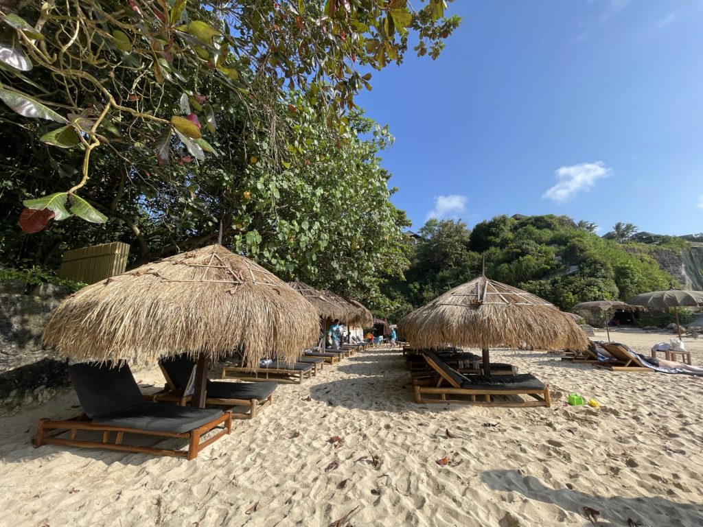 クブビーチに到着。目の前には、美しい海と広がる空の絶景が広がっていました。リゾート内とは思えないほど自然に囲まれた空間で、インドネシアの大自然を存分に感じることができました!