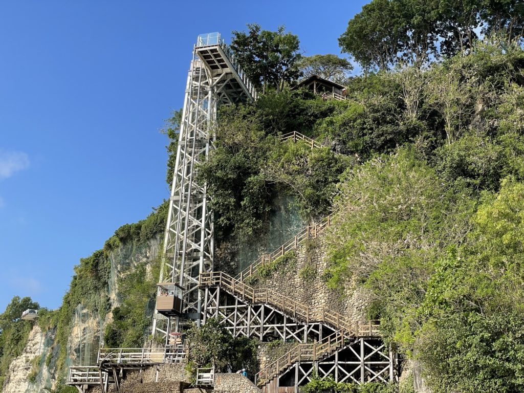 クブビーチへ行くには、崖に設置された専用エレベーターを利用してアクセスします。