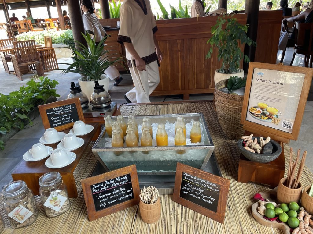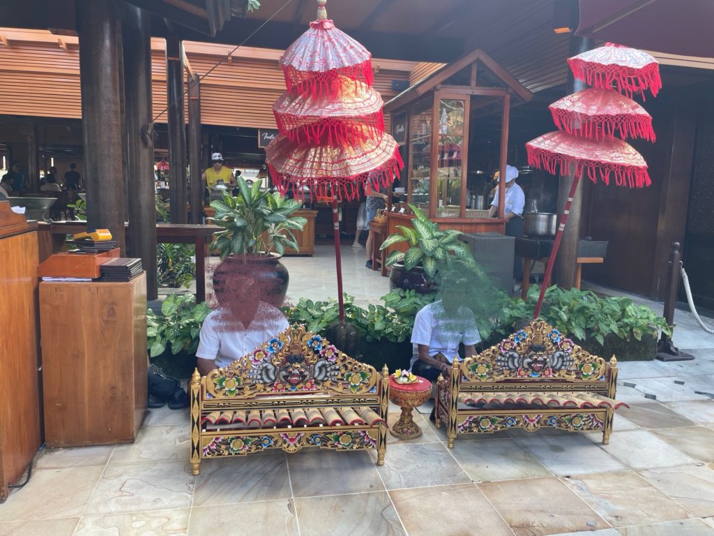 朝食会場の入口では、ガムランの生演奏が行われていました。子どもがじっと見ていると、演奏者の方が気を利かせて子ども向けの音楽を弾いてくれる場面も。