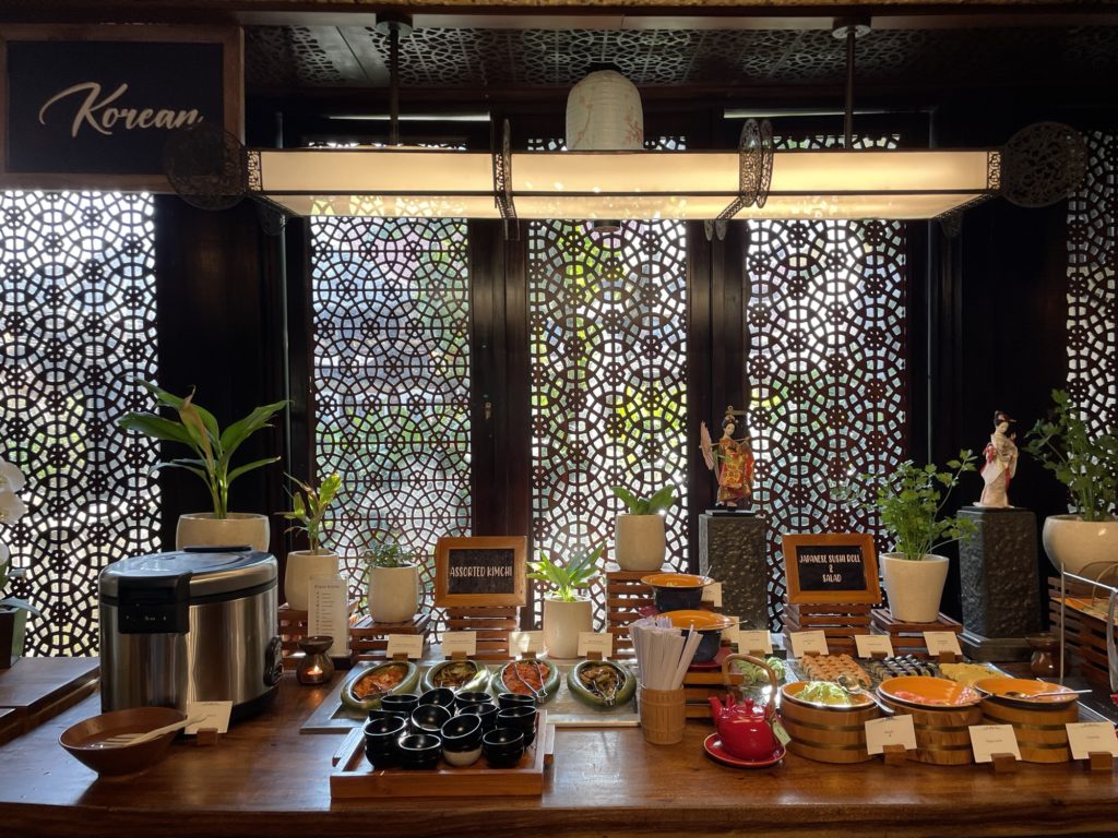 こちらは、朝食ビュッフェの一部の写真になります。全体の雰囲気が少しでも伝われば嬉しいです。子連れ旅行ではいつも「朝食ビュッフェだとシリアルやドーナツを選びがちで子どもの野菜不足が気になるな」と思っているのですが、ここではミーステーションでほうれん草の麺を選べたのが嬉しかったポイント。