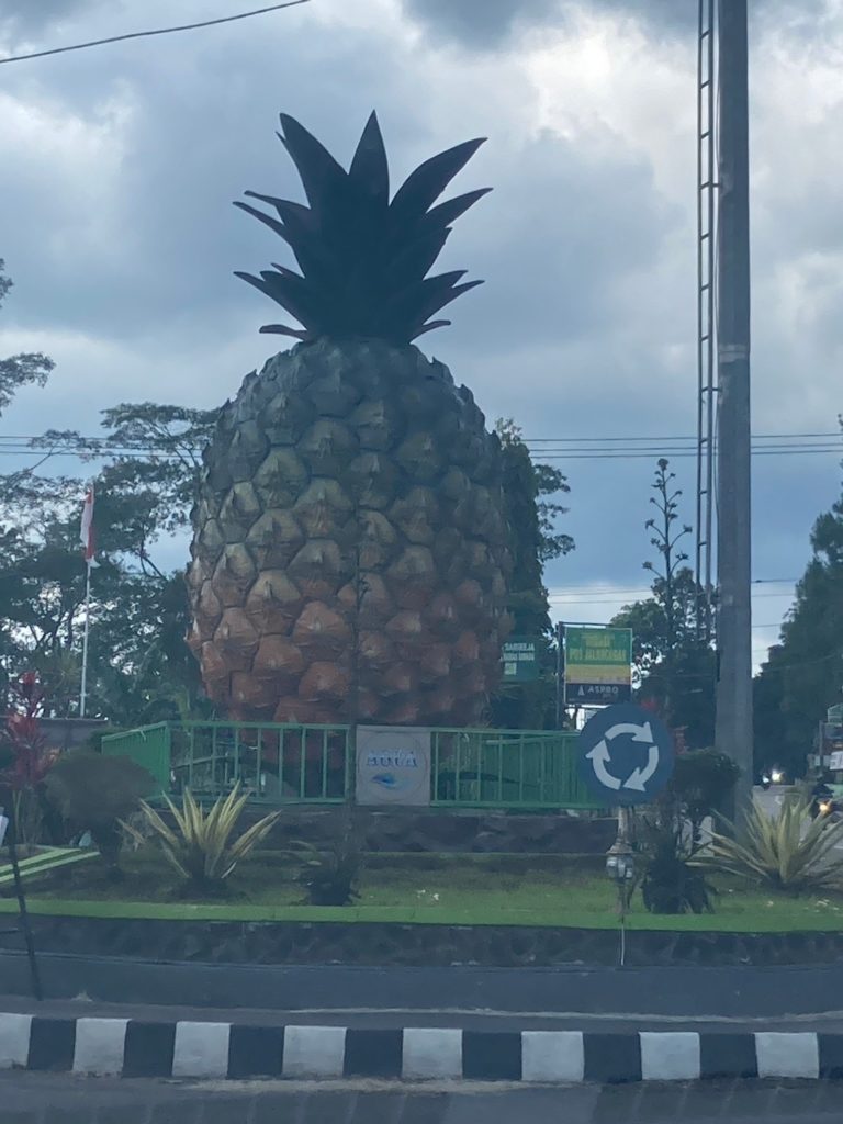 タンクバンプラフ火山の20kmほど手前、巨大パイナップルのモニュメントTugu Nanas(Google Map)が現れました。「このあたりはパイナップルが有名だよ~」と運転手さん。暫くするとパイナップルを売っているお店がズラリ。