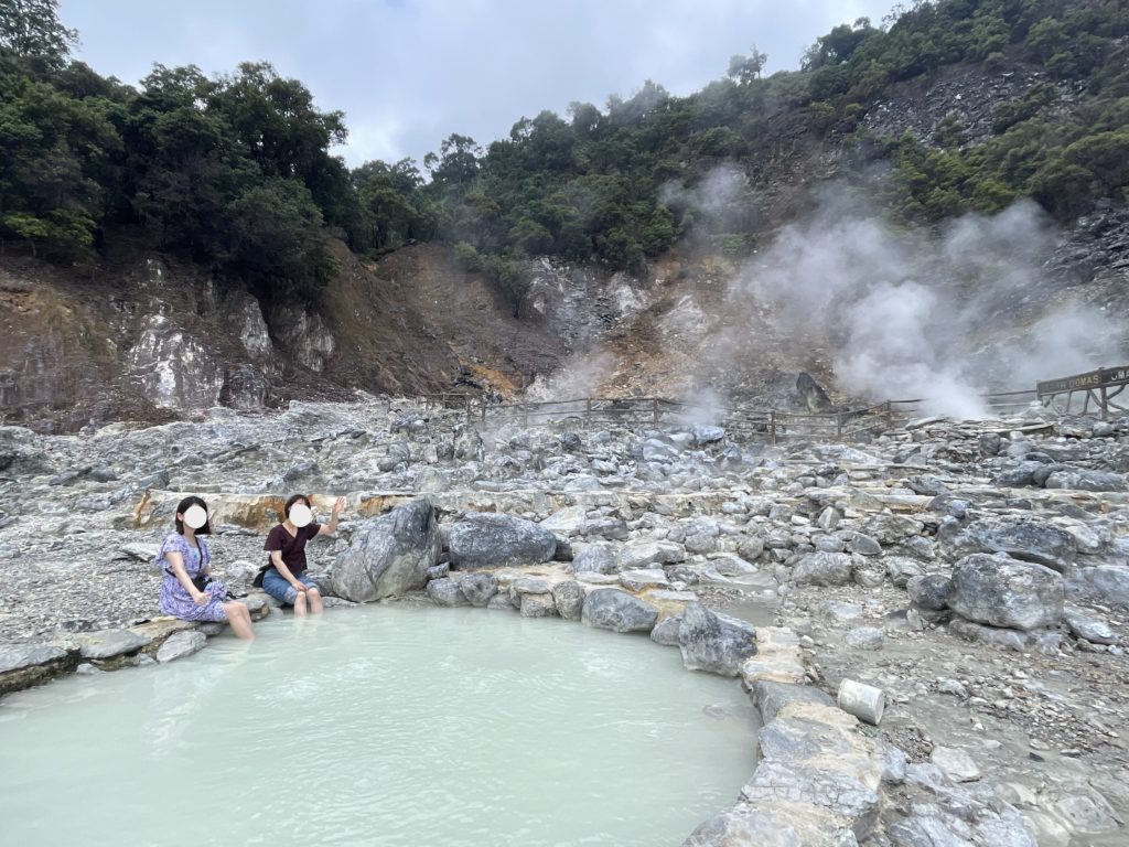 火山口から40分程下ったところで、無事に温泉Kawah Domasに到着!写真のような温泉がいくつかあり、うち1つの温泉では温度がそれほど高くはなく、足湯を楽しむことができました。こちらも貸し切り状態でした。