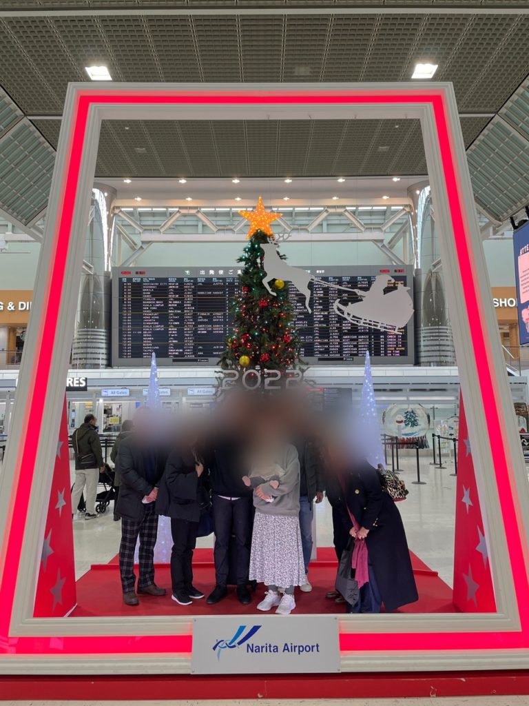 無事チェックインを済ませ、お見送りに来てくれた家族や友人と最後の時間。クリスマスだったこともあり、ツリーの前で記念撮影。