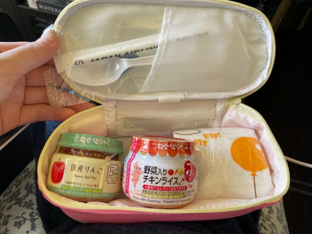 お湯も機内のものを使えるとのことで、CAさんに哺乳瓶とスティックのミルクを渡してミルクづくりをお願いしました。飲み終わった哺乳瓶も、消毒を兼ねてお湯で洗って貰いました。感謝です。