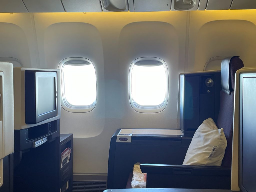 座席はバジネットが使用できる一番前。席が独立していて広々しているので、子連れフライトの不安が軽減しました。