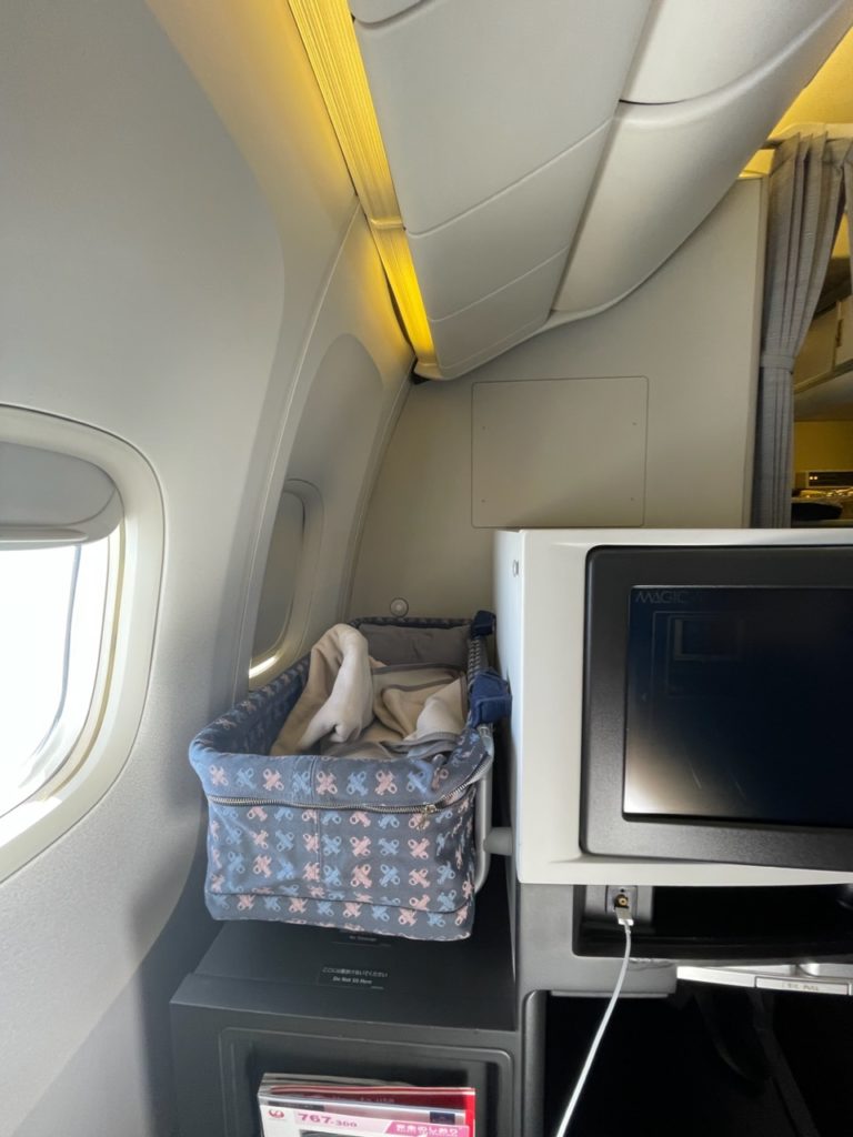離陸後、シートベルトサインが消えてからバジネットを取り付けて貰いました。結論、娘は抱っこ紐の方が沢山寝てくれるので、実質1時間も使用せず。