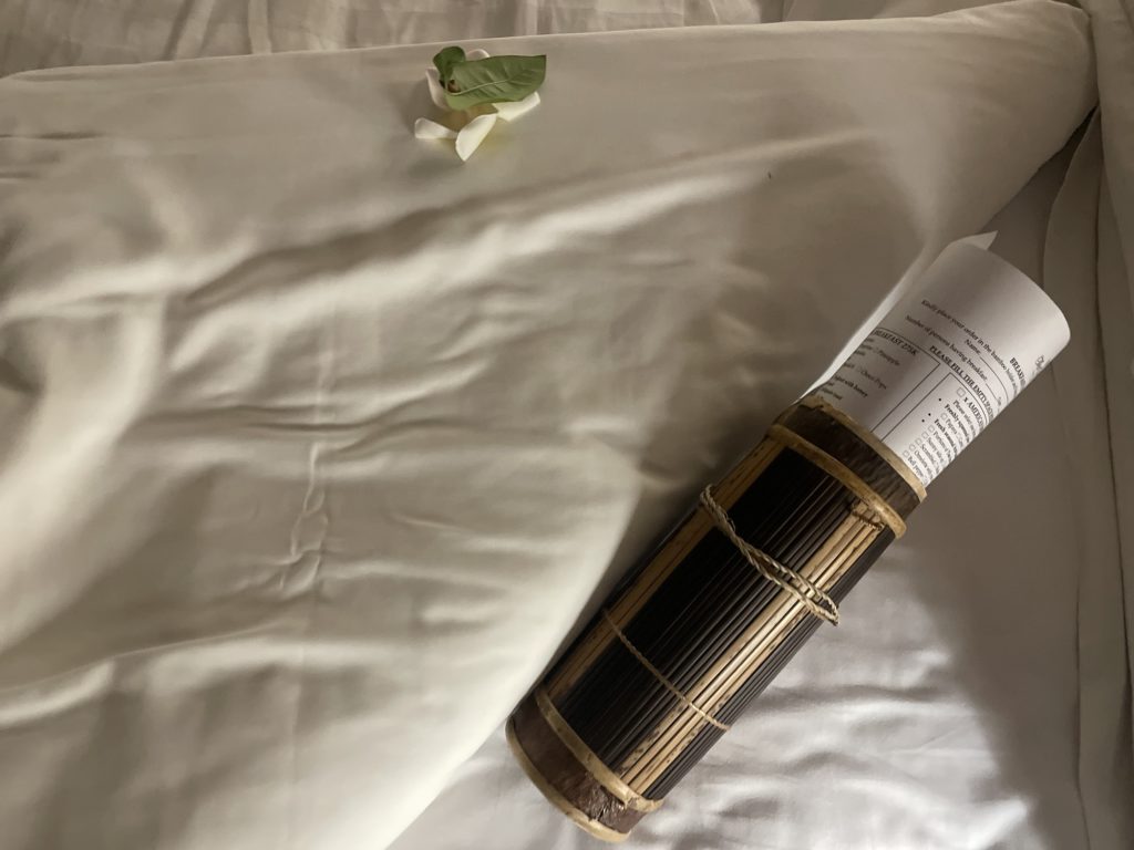 清掃後、ベッドの上に筒が。中をウキウキと見てみると、モーニングのメニューが入っていました!午前2時迄(!)に記入して外のドアノブにかけておけば、翌朝希望時間に朝食が運ばれてくるとのことです。