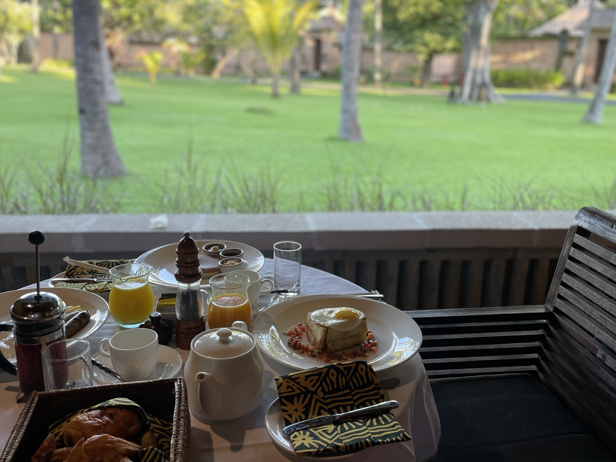 翌朝、希望通りの時間に朝食が運ばれてきました。せっかくなのでガーデンビューのバルコニーでいただくことに。テーブルに乗りきらないほどの食事が運ばれてきてテンションが上がります!