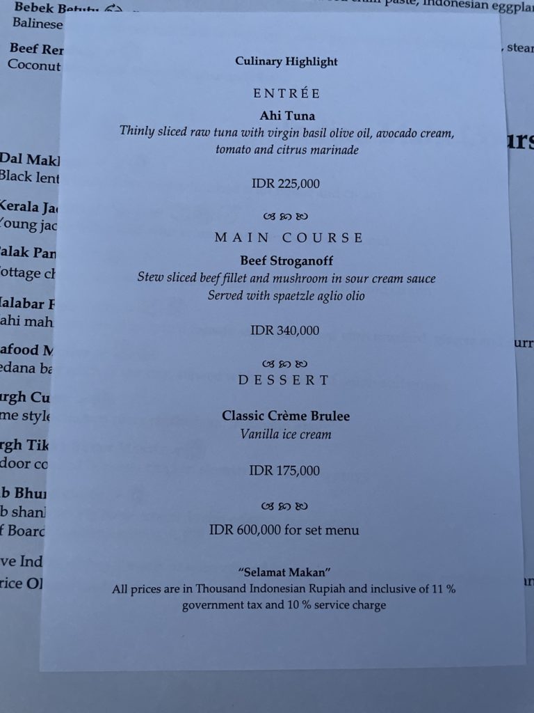 3泊のうち2泊のディナーは、コースではなくアラカルトをオーダー。インドネシア料理は勿論、インド料理や西洋料理など選択肢がとても幅広く、食べたいメニューがありすぎて嬉しい悩み!あーだこーだ言いながら時間をかけてオーダー。