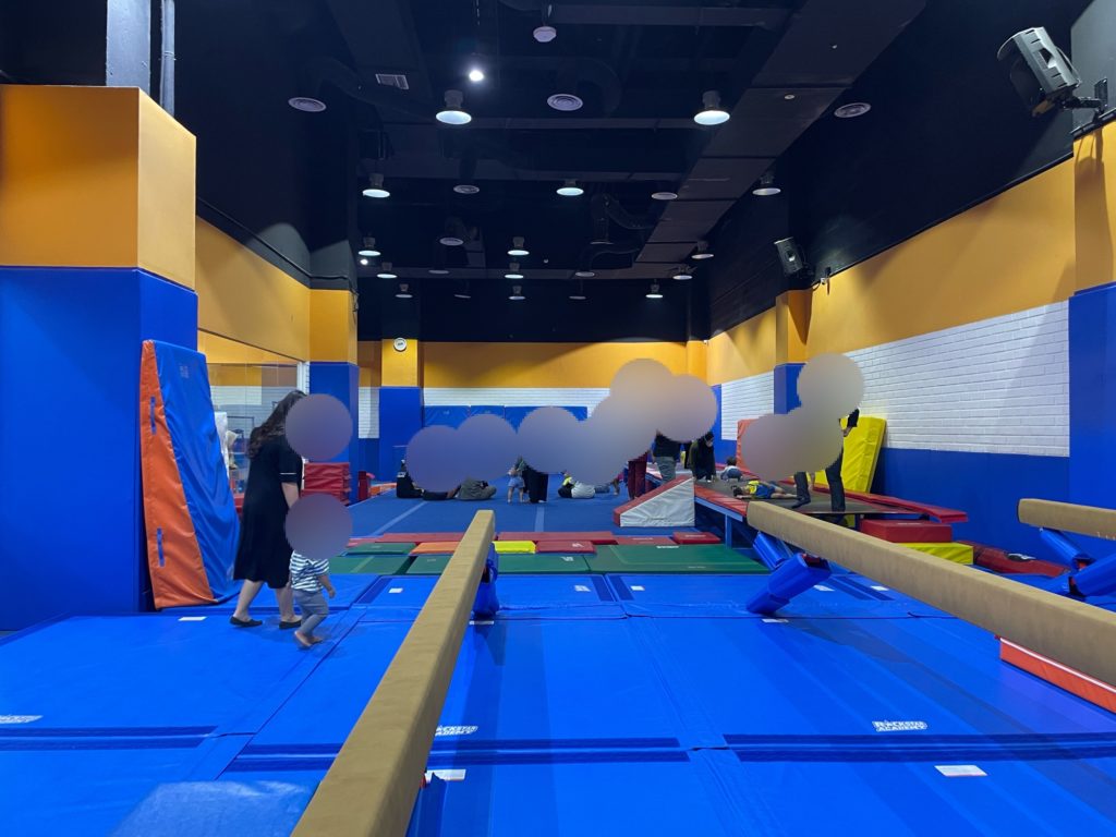 残りの40分弱で自由に遊具を使って身体を動かして遊びます。遊具は鉄棒・平均台・トランポリンなど。0歳から使う遊具はほぼ同じですが、年齢が上がるにつれて補助の仕方が変わったり、ジャンプの動きを取り入れる等、難易度が少しずつ上がっていきます。