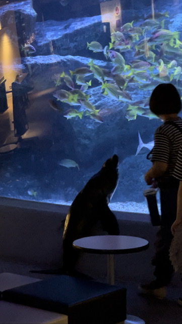 なんと!オットセイのお散歩に遭遇!普通にわたしたちと同じ通路を歩いていてびっくりしました。(絨毯の上・・・)