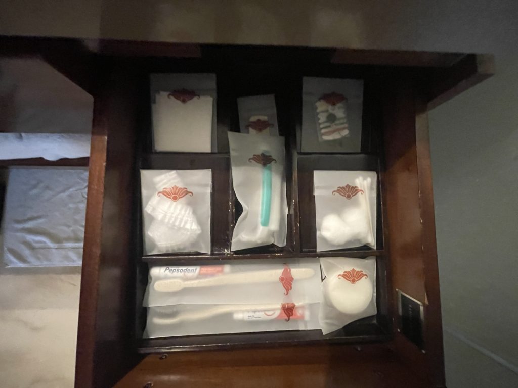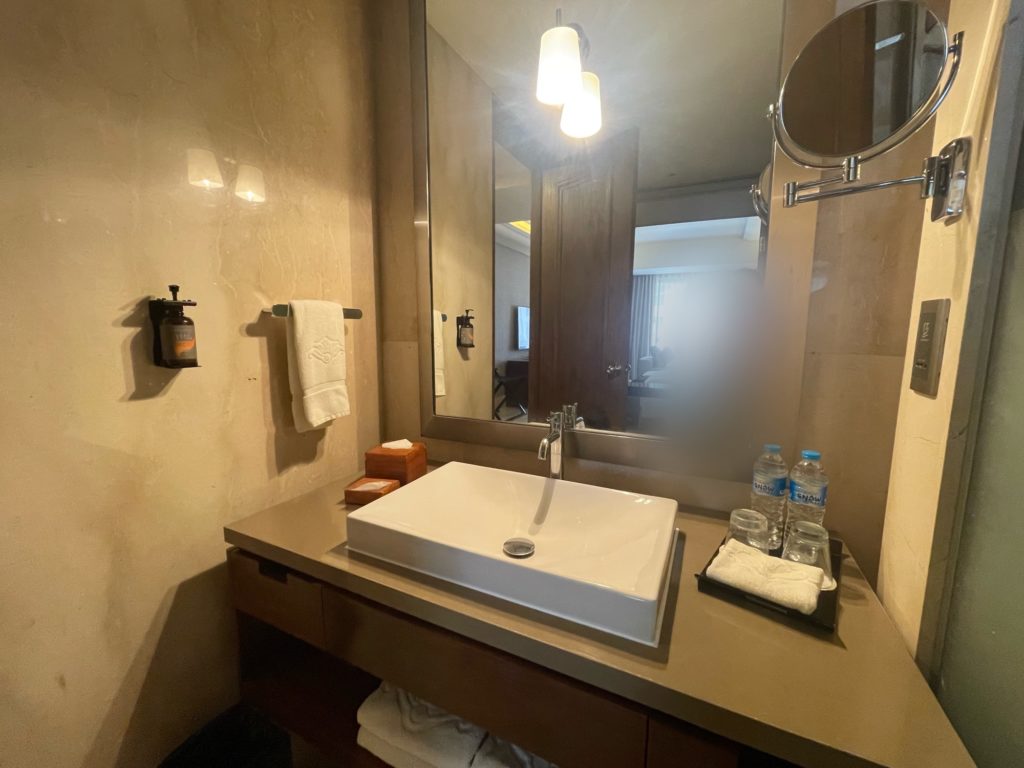 続いては洗面台の様子です。アメニティは基本的なものは全て揃っていました。基礎化粧品は持参が必要です。写真を撮っていませんがドライヤーも勿論あります。