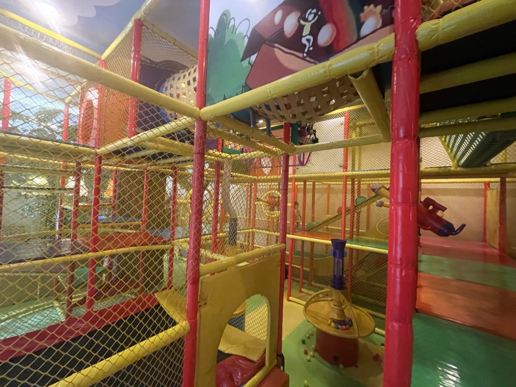 キッズルームのメインの遊び場は3階層になっており、アクティブな娘はここで大はしゃぎ。ボールの大砲やトランポリンもありました。