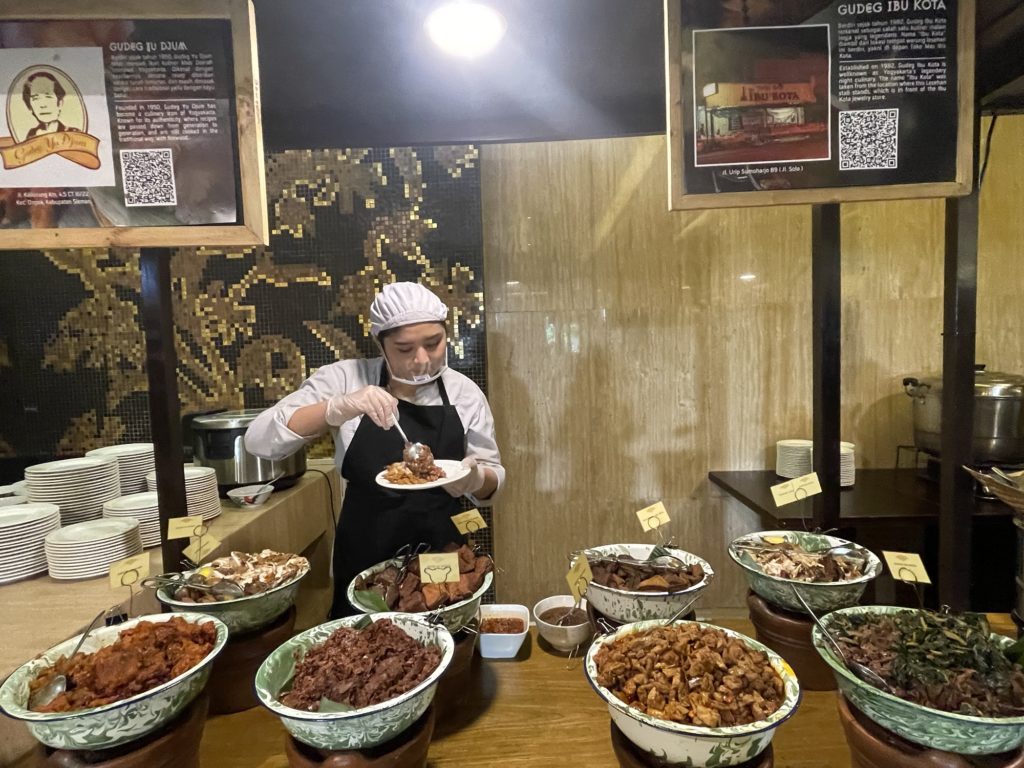 カウンターで様々なインドネシア料理を作ってもらうことが出来ました。メニュー名が分からなくてもディスプレイがあるから安心してオーダー出来ます。有名なジョグジャカルタ料理グデッグ(ジャックフルーツをココナツミルクで煮込んだ料理)等も置いてありました。